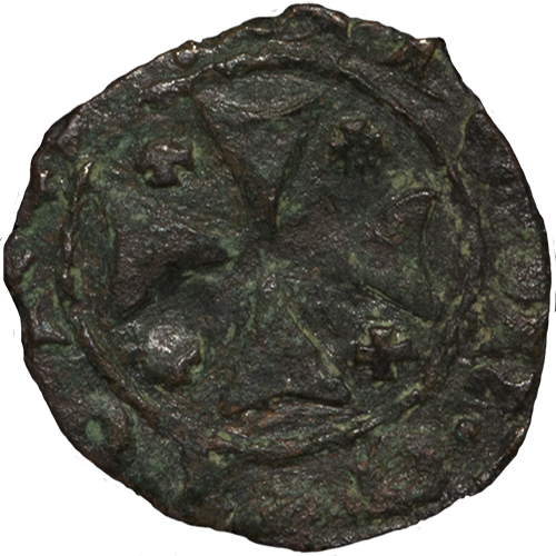 The king seated upon throne, holding in sceptre right hand and globus cruciger in left. In left field, cross.
