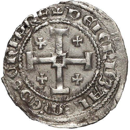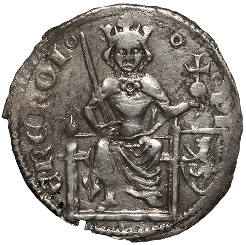 The king seated on ornate throne, holding unsheathed sword in right hand and globus cruciger in left; on his left and fixed on the throne, shield with the lion of Cyprus.