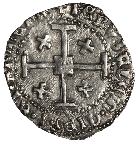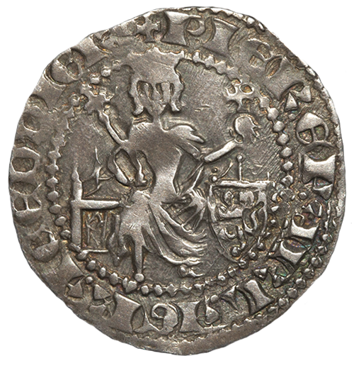 The king seated upon throne, holding in sceptre right hand and globus cruciger in left; on his left and fixed on the throne, shield with the lion of Cyprus.