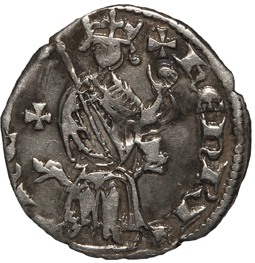 The king seated upon throne, holding sceptre in right hand and globus cruciger in left. In left field, cross.