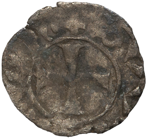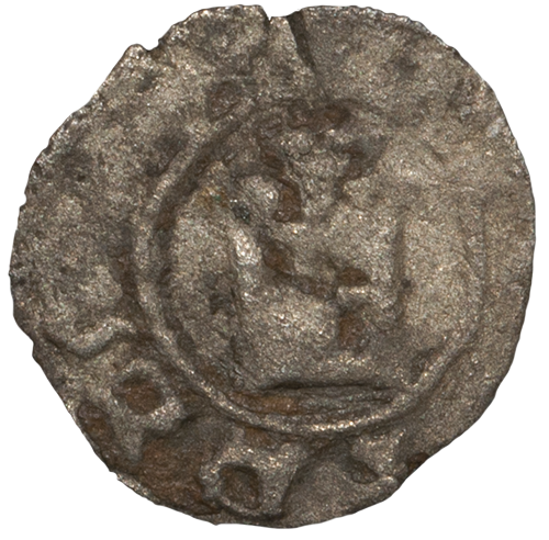 The king seated upon throne, holding in sceptre right hand and globus cruciger in left. In left field, cauldron (?).
