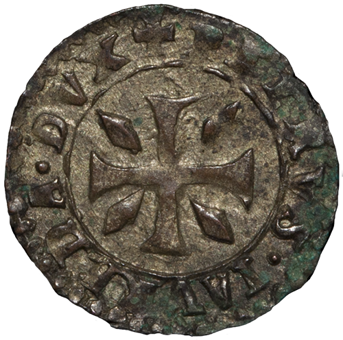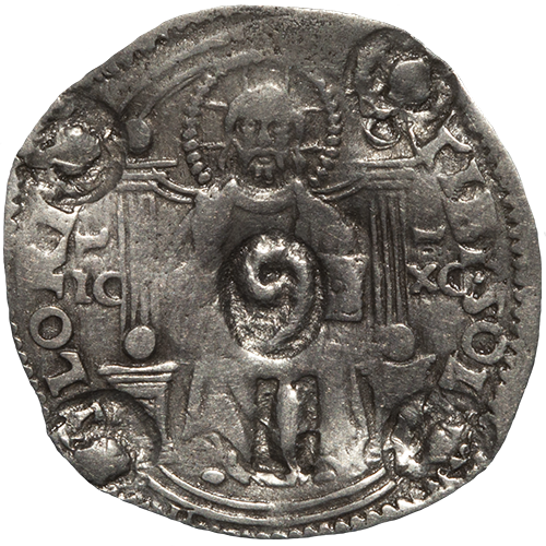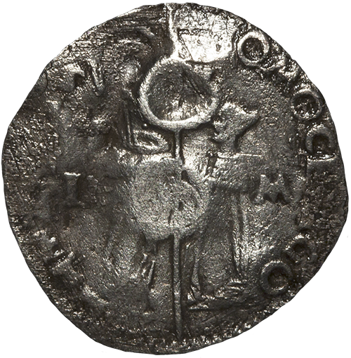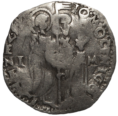 The doge kneeling left, in front of St. Mark holding labarum; along the labarum, DVX; in left field, I; in right field, M.